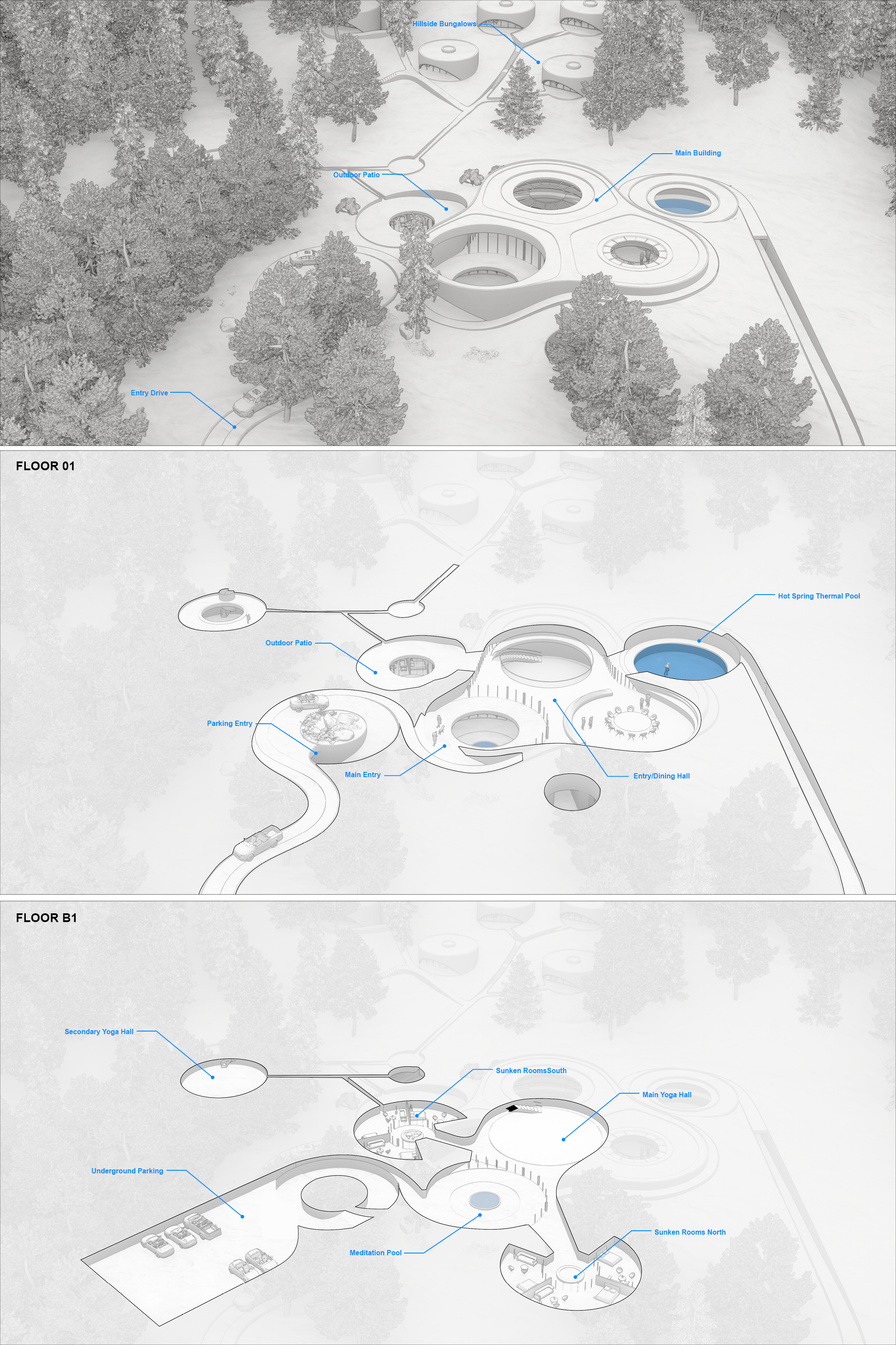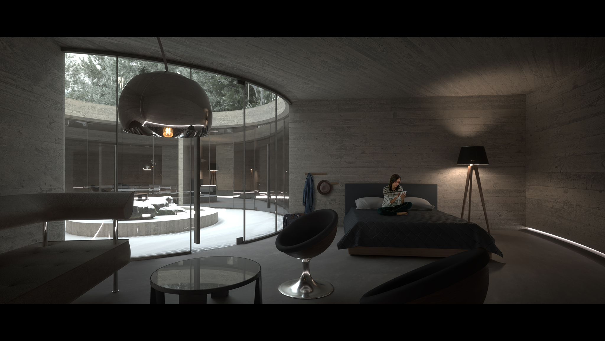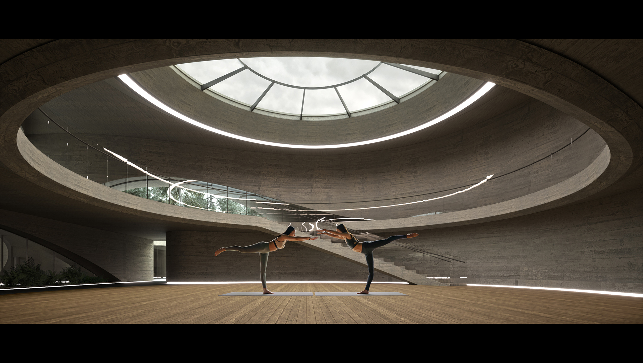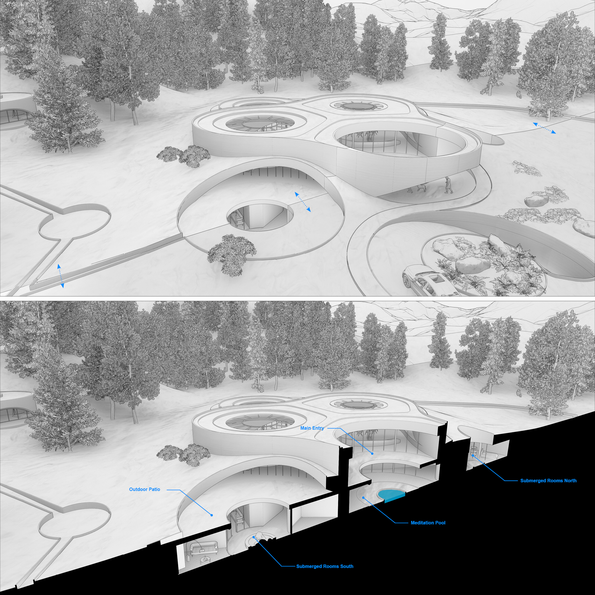 A Place In the Woods Yoga Center draws heavily from bunker architecture as a point of inspiration. The static, heavy, and submerged quaility of bunkers inform a very particular type of habitation. One that is both quiet and inward looking. The goal of this project was to join the bunker aesthetic with spaces that are flooded with light via roof oculi, to create a place that inspires moments of self reflection and openness to new ideas. Sited in a remote wood, the Yoga Center provides guests a place to detach from the outside world and surround themselves with nature.