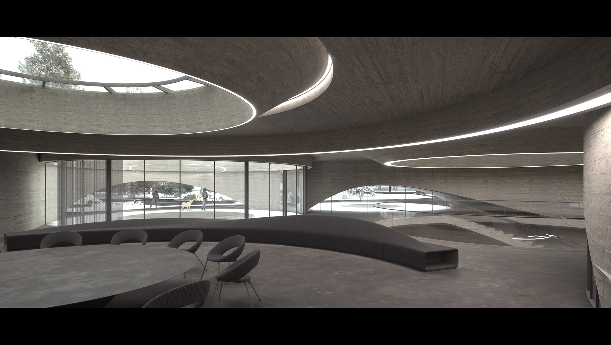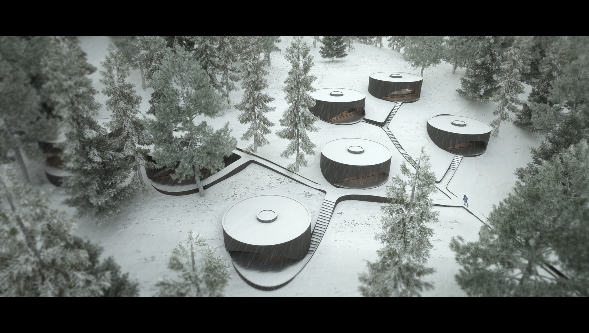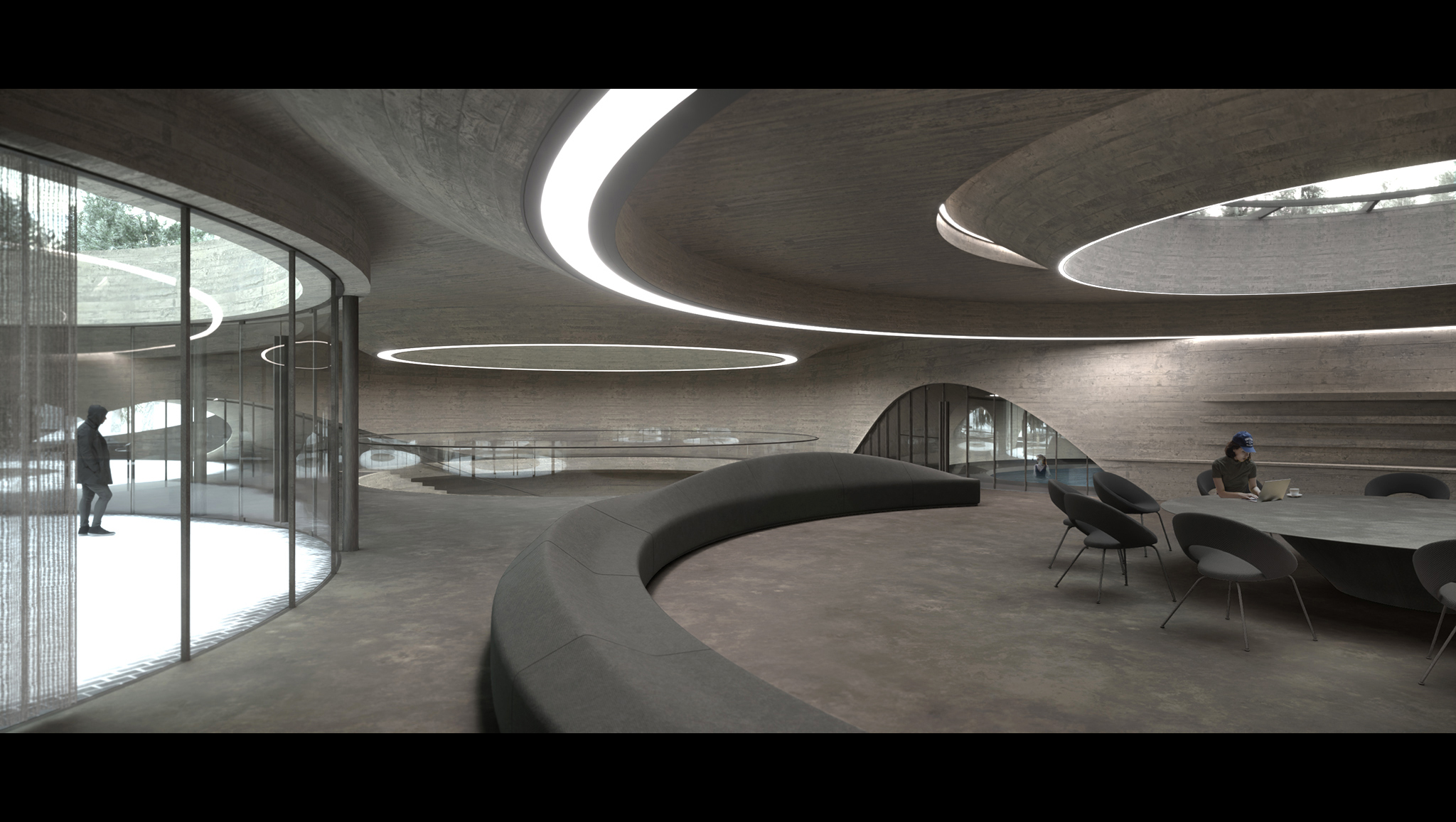 A Place In the Woods Yoga Center draws heavily from bunker architecture as a point of inspiration. The static, heavy, and submerged quaility of bunkers inform a very particular type of habitation. One that is both quiet and inward looking. The goal of this project was to join the bunker aesthetic with spaces that are flooded with light via roof oculi, to create a place that inspires moments of self reflection and openness to new ideas. Sited in a remote wood, the Yoga Center provides guests a place to detach from the outside world and surround themselves with nature.