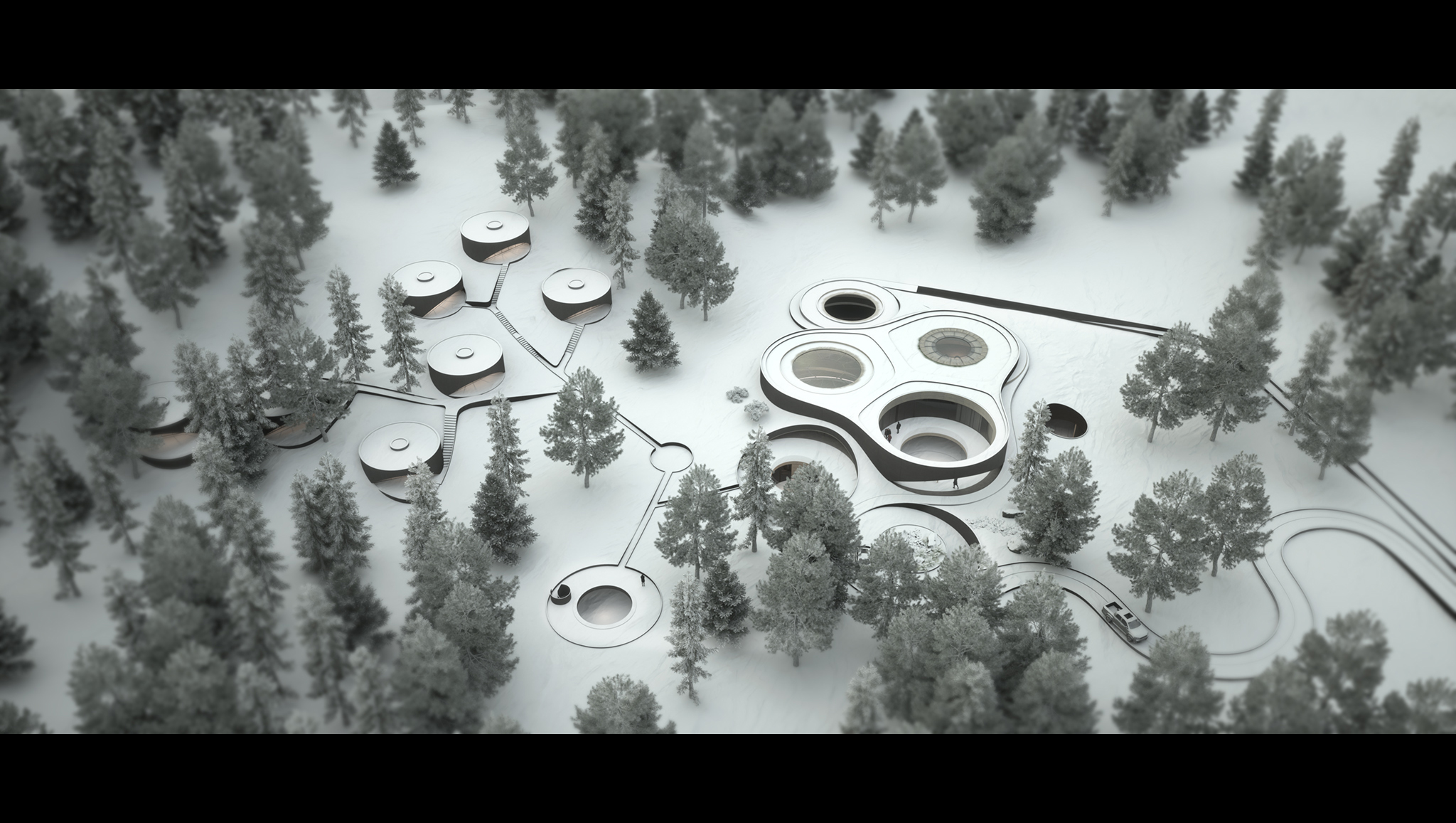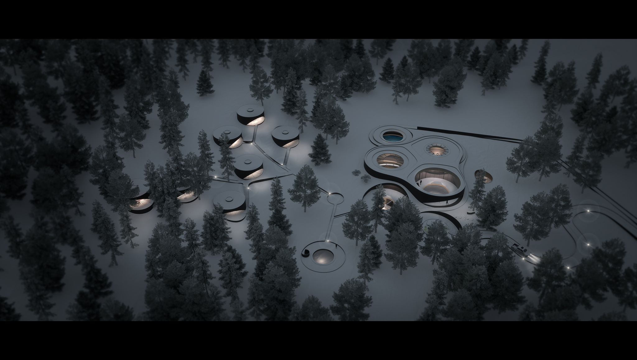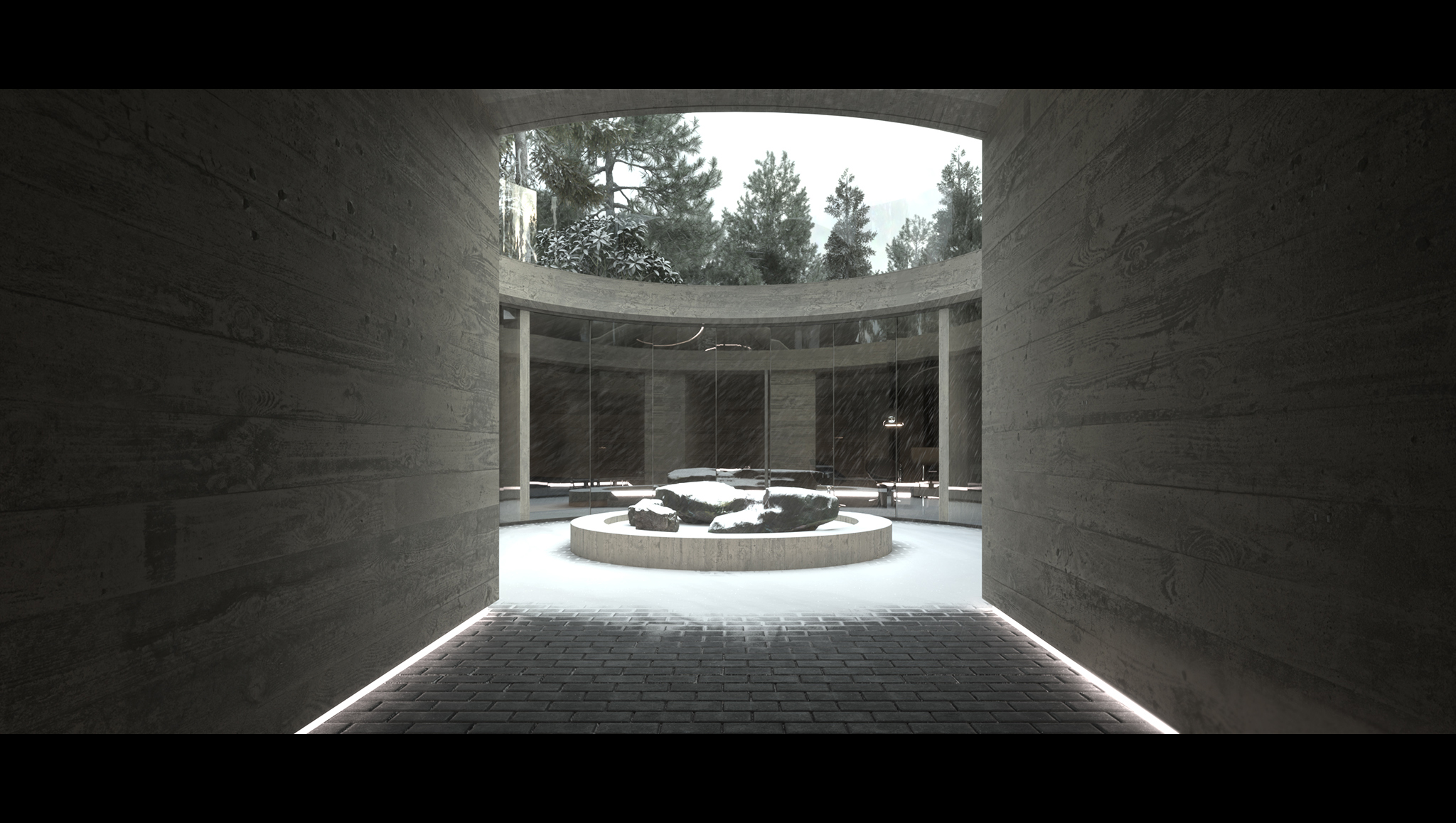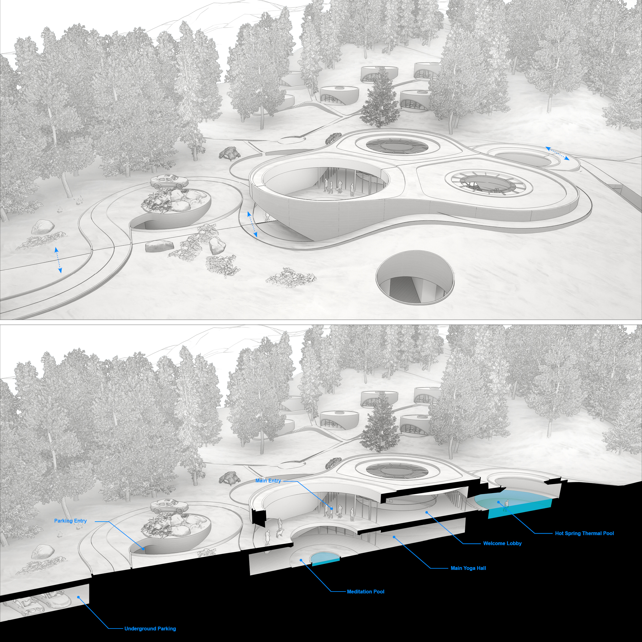 A Place In the Woods Yoga Center draws heavily from bunker architecture as a point of inspiration. The static, heavy, and submerged quaility of bunkers inform a very particular type of habitation. One that is both quiet and inward looking. The goal of this project was to join the bunker aesthetic with spaces that are flooded with light via roof oculi, to create a place that inspires moments of self reflection and openness to new ideas. Sited in a remote wood, the Yoga Center provides guests a place to detach from the outside world and surround themselves with nature.