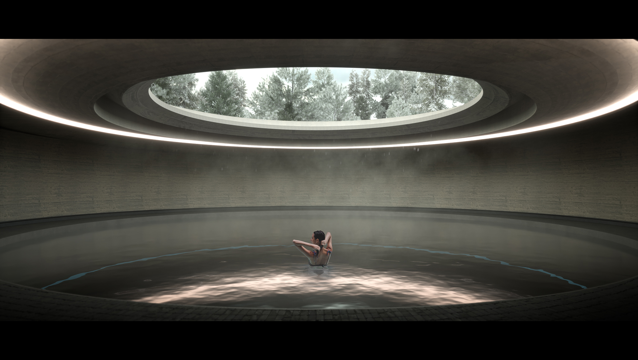 A thermal hot spring connects to the main entry hall for a place of relaxation.